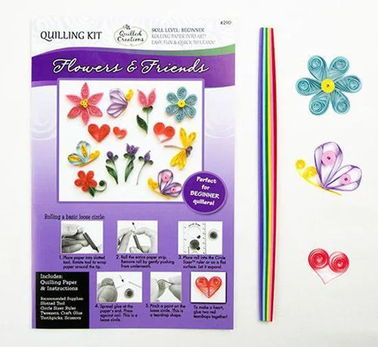 This quilling kit includes simple flowers and butterflies to delight anyone new to quilling! Develop basic quilling skills and learn a fun technique called "alternate side looping". Includes 1 set of instructions and quilling paper. Quilling paper is 8" long, 1/8" wide.