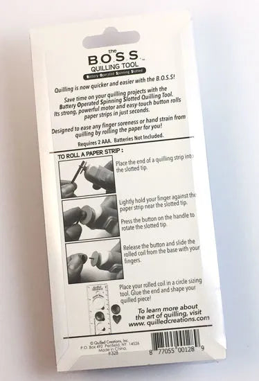Quilling is now quicker and easier with the B.O.S.S. (Battery Operated Spinning Slotted) Tool! Save time on your quilling projects. It's strong, powerful motor and easy-touch button rolls quilling paper strips in just seconds. Designed to ease any finger soreness or hand strain.
